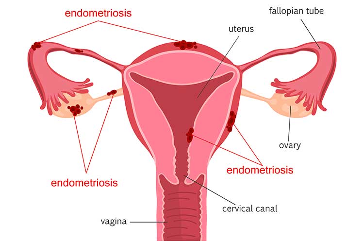 It is believed that stray endometrial tissue (known as endometrial implants or lesions) continues to behave as it would inside the uterus. It thickens, breaks down, and bleeds with each menstrual cycle. Because the stray tissue can’t leave the body as normal menstrual blood would, it remains inside the pelvis and causes inflammation (Queensland Health 2019).